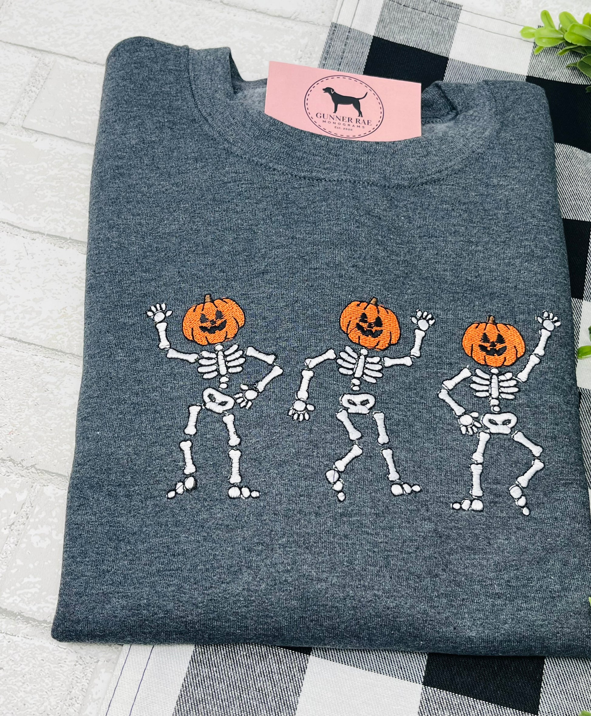 Celebrate the spooky season in style with this handmade embroidered DANCING SKELETONS sweatshirt, thoughtfully crafted with care and detail. Whether you prefer a cozy sweatshirt or a classic t-shirt, you can fully customize your garment choice and color to match your personal style.