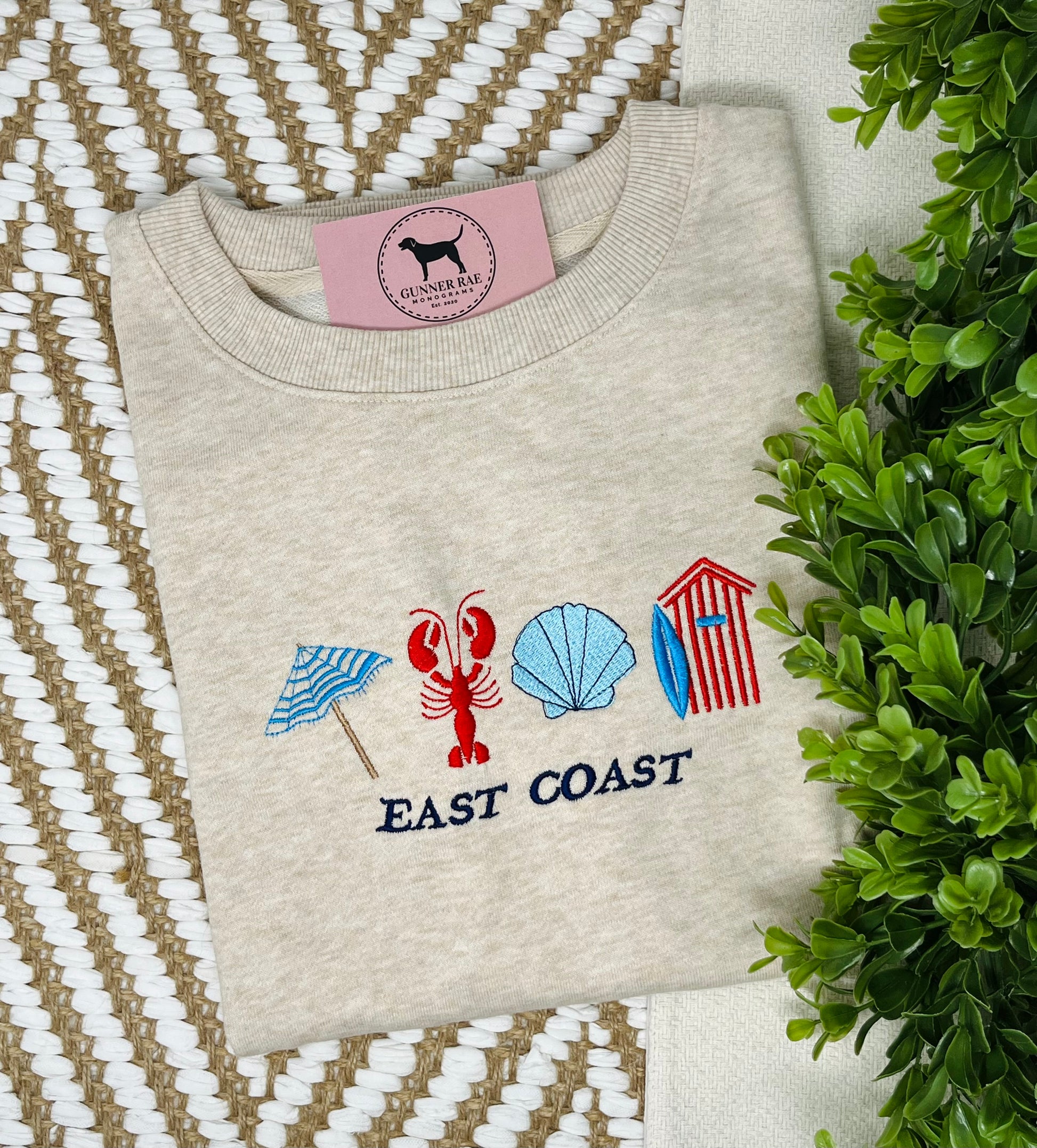 Bring coastal charm and salty air vibes wherever you go with this handmade, embroidered East Coast t-shirt or sweatshirt-both customizable in size and color to best suit your style. Each shirt is crafted with care using high quality thread on a soft, comfortable cotton-based garment. Whether you're strolling the Cape, enjoying a lobster roll in Maine, or dreaming of Nantucket, this piece brings spirit of the East Coast to your everyday wardrobe.